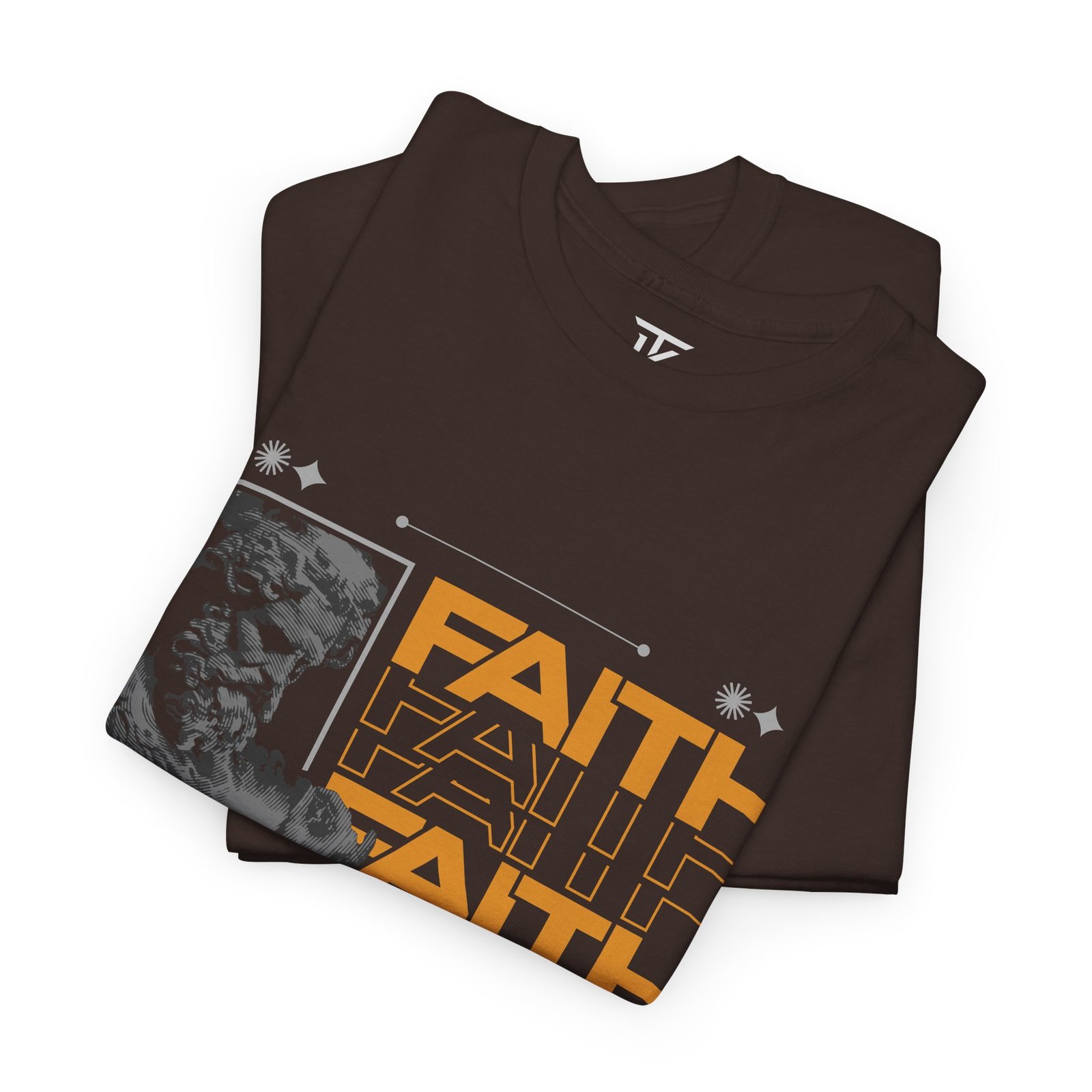A bold, everyday tee that wears like confidence. This classic black cotton shirt carries a graphic story across the chest — layered typography reading FAITH with a distressed statue photo and technical accents in warm orange and gray. It feels like a quiet declaration: steady and deliberate, not loud. Wear it when you need a little courage at a late-night show, while walking city streets, or layered under a jacket for a creative meeting. The soft, midweight fabric and relaxed cut move with you without asking for attention. Details like a ribbed collar, taped shoulders, and a tear-away label keep the focus on the message, while durable printing methods lock in the sharp artwork so it ages with character.