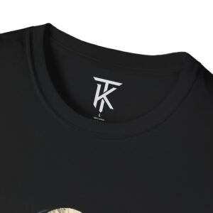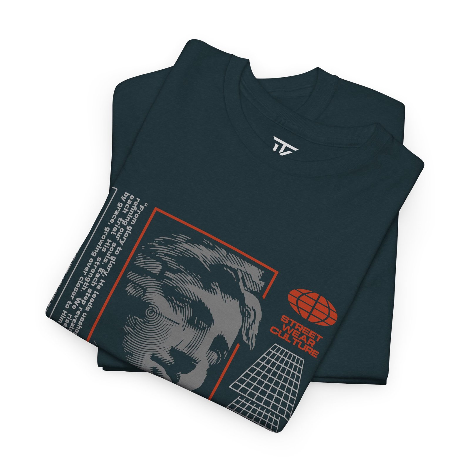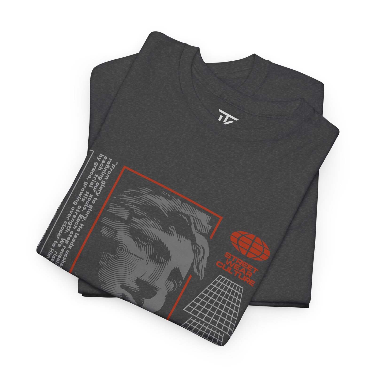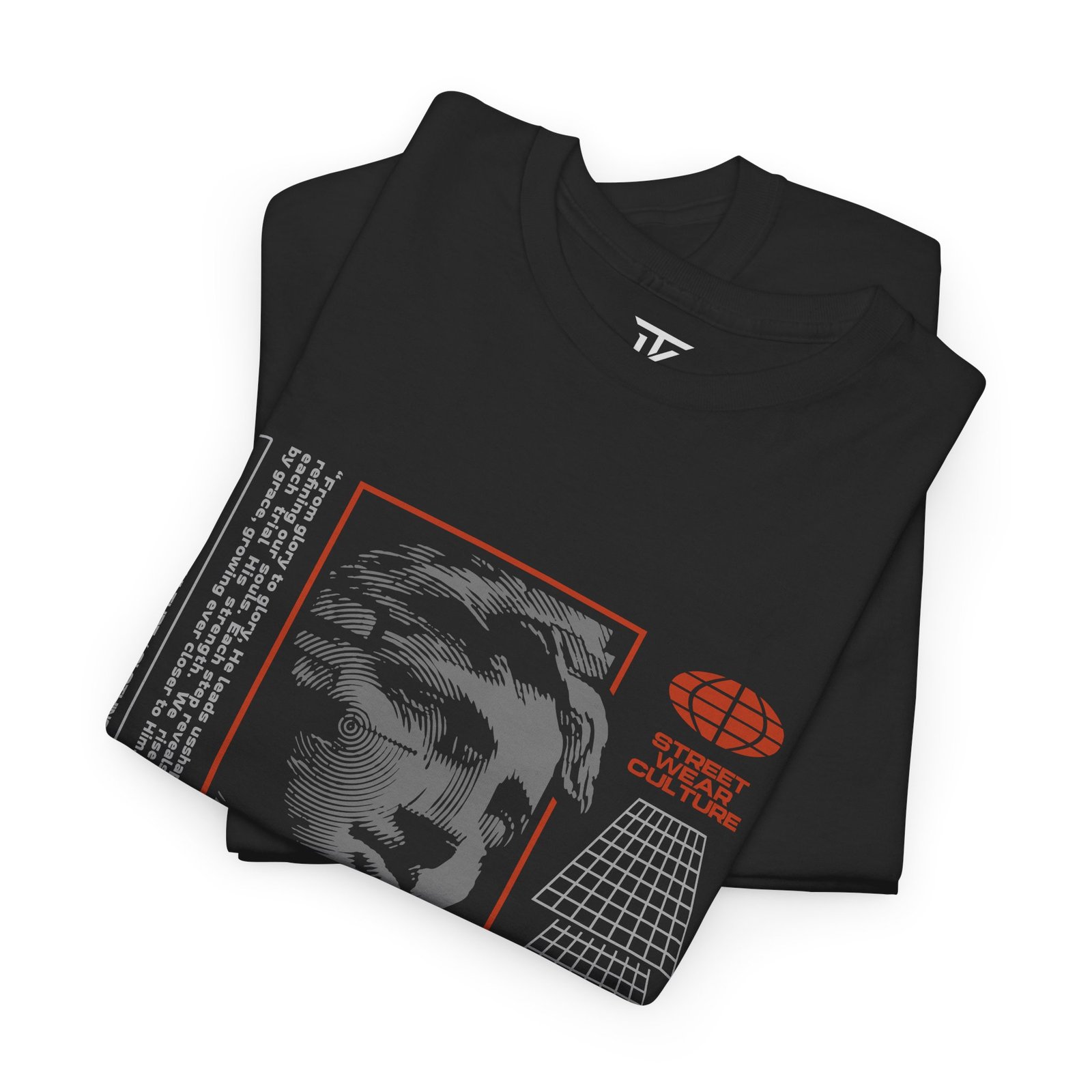 A bold, everyday tee that wears like confidence. This classic black cotton shirt carries a graphic story across the chest — layered typography reading FAITH with a distressed statue photo and technical accents in warm orange and gray. It feels like a quiet declaration: steady and deliberate, not loud. Wear it when you need a little courage at a late-night show, while walking city streets, or layered under a jacket for a creative meeting. The soft, midweight fabric and relaxed cut move with you without asking for attention. Details like a ribbed collar, taped shoulders, and a tear-away label keep the focus on the message, while durable printing methods lock in the sharp artwork so it ages with character.