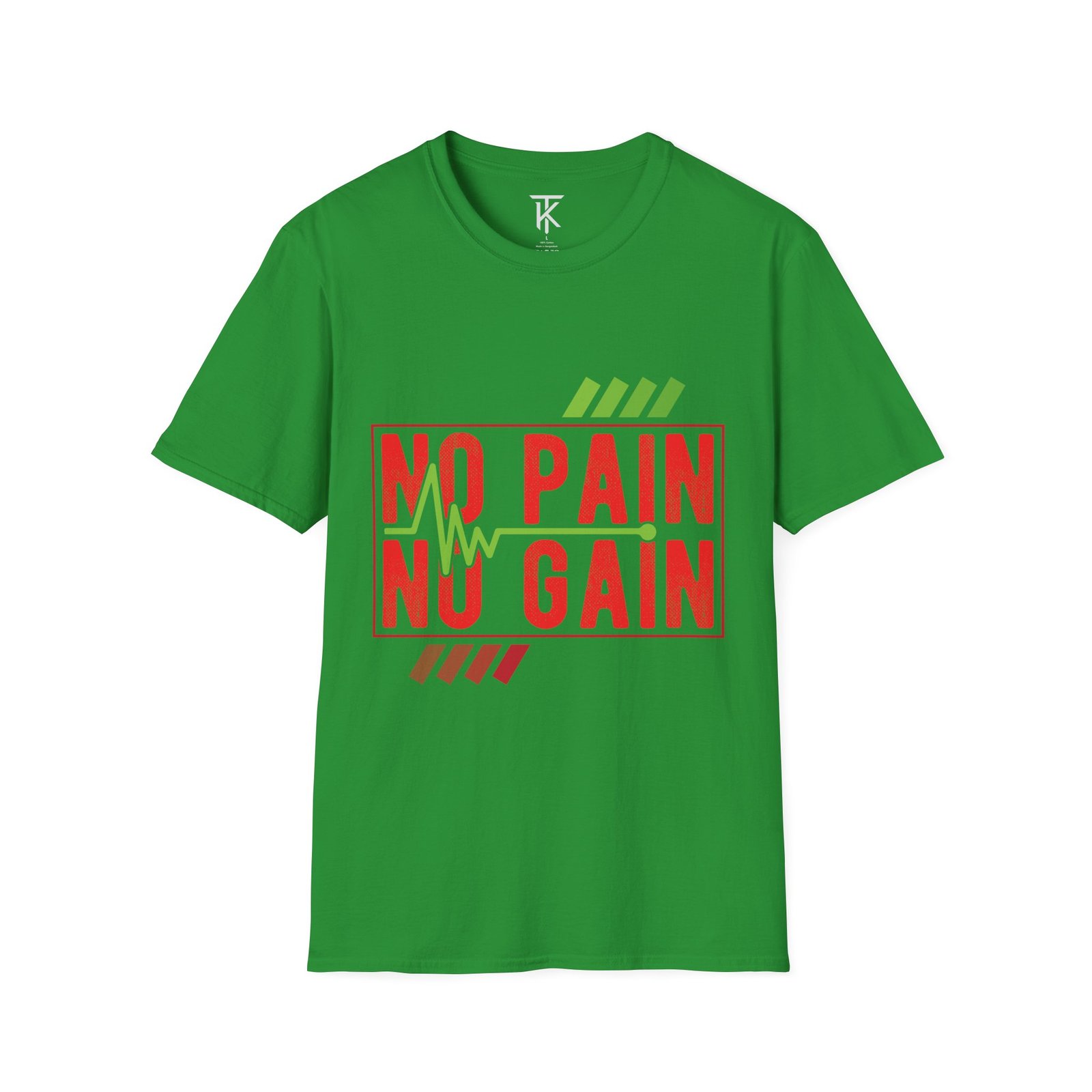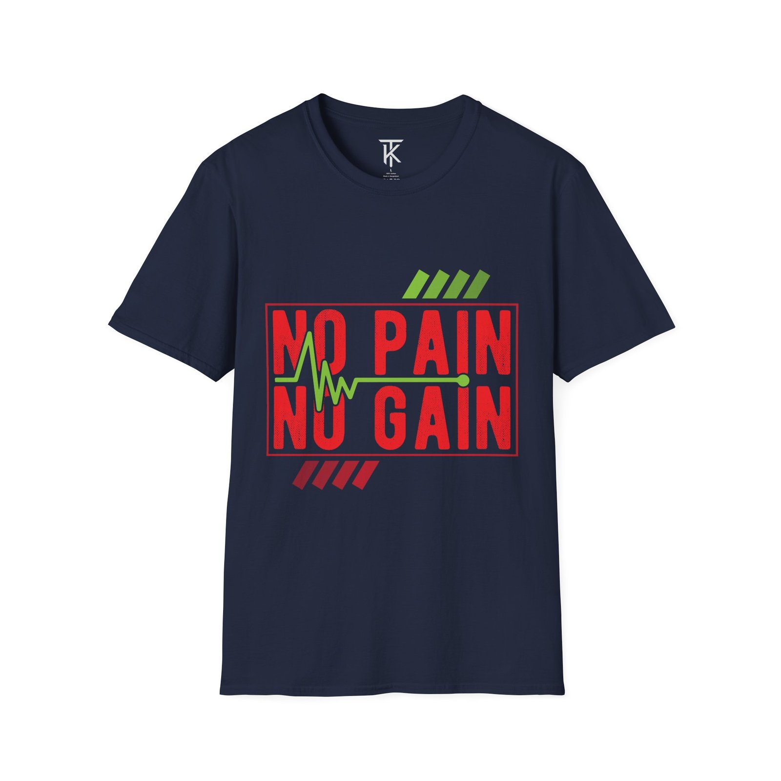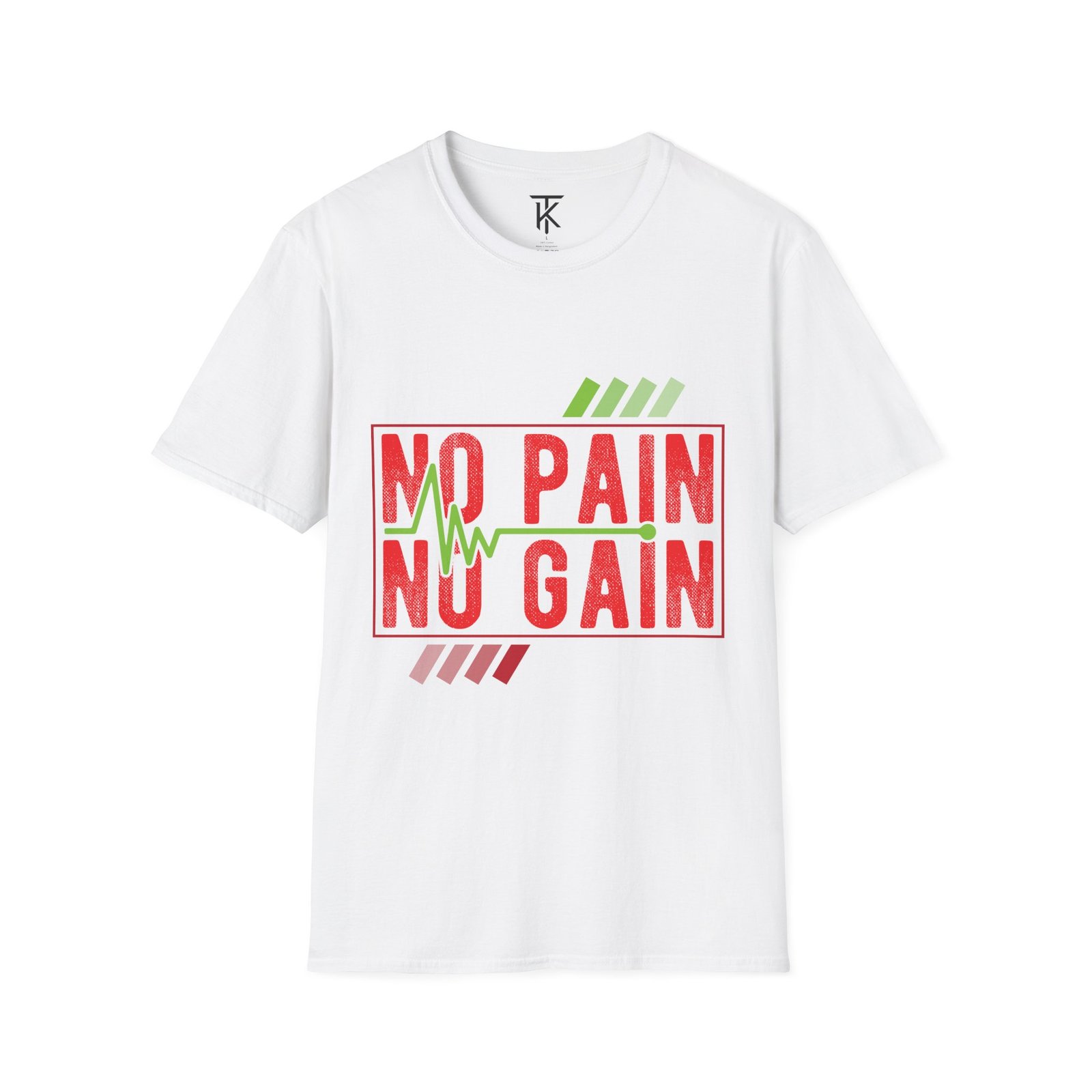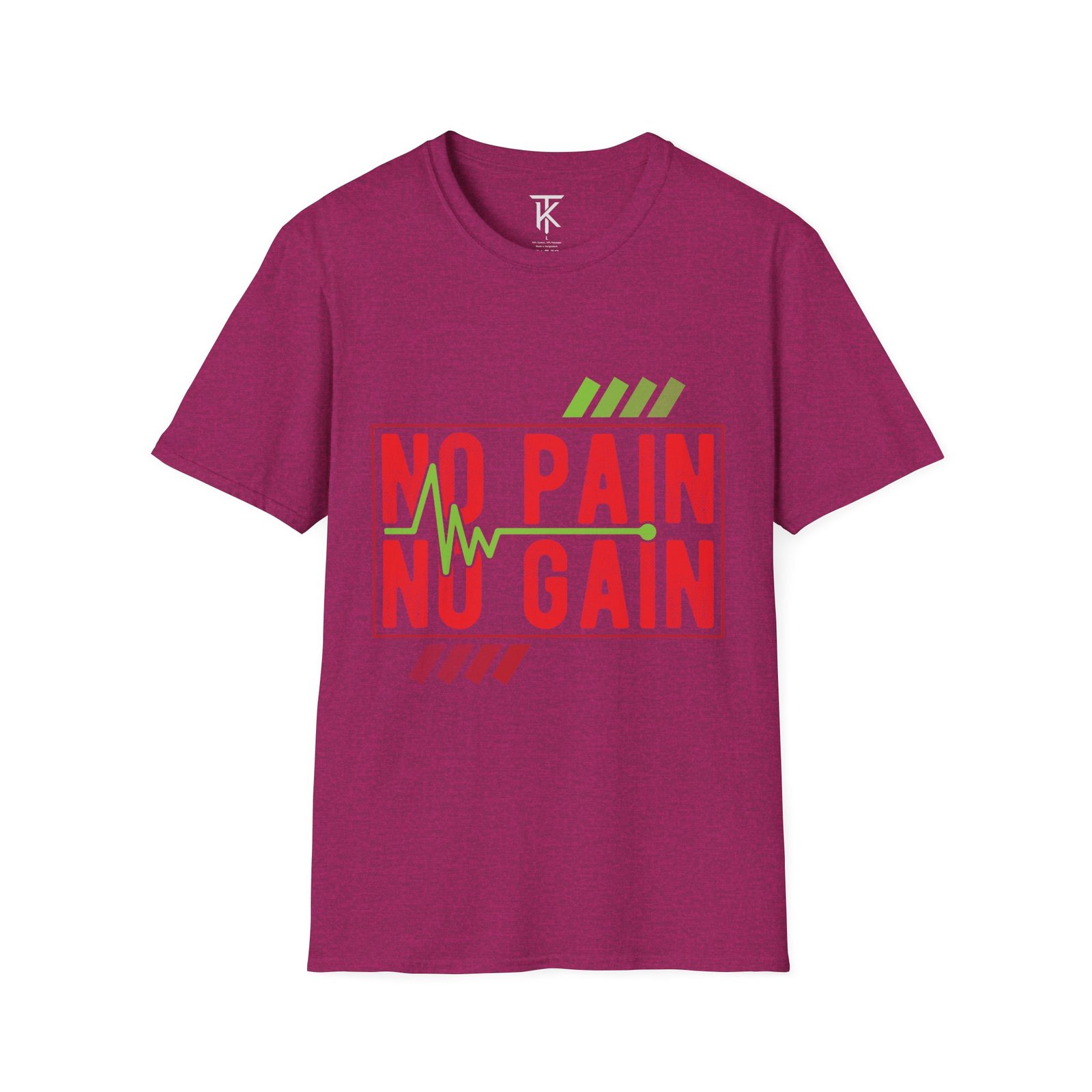 A clean, lightweight tee stamped with bold ‘NO PAIN NO GAIN’ lettering and a heartbeat motif — made to move with you. The soft, ring-spun cotton feels breathable during workouts and everyday runs, while the tubular knit and shoulder tape keep the silhouette smooth and long-lasting. Wear it to the gym, on early morning runs, or layered under an open hoodie; the graphic speaks to grit without shouting. It sits true to classic crew proportions and carries a subtle vintage texture in the print that pairs with training shorts or worn denim. Ethically sourced cotton and a tear-away label make it comfortable and conscientious for regular wear.